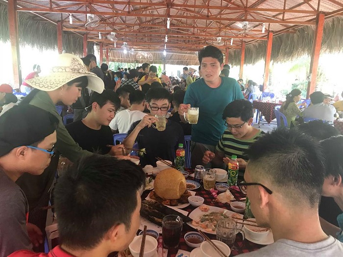 - Quí khách sẽ dùng cơm trưa tại nhà hàng sinh thái miệt vườn (gần đó) với những thực đơn đặc trưng của dùng sông nước ( cùng những con cá, tôm, tép…. mà du khách vừa bắt được).